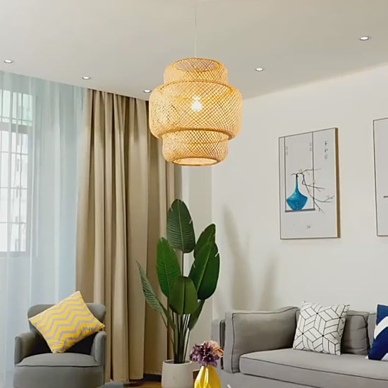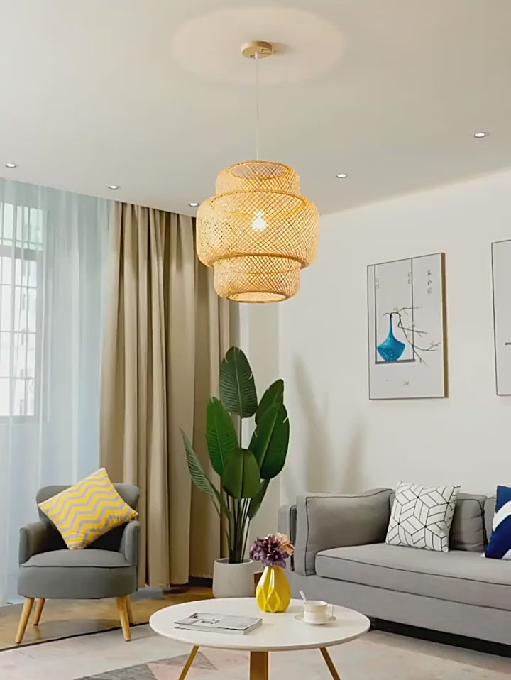 bamboo pendant lamp, woven lampshade, hand‑knitted light, natural lighting fixture, Chinese style lamp, wooden pendant light, eco‑friendly lamp, cord pendant, artisan bamboo shade, Japandi lighting, rustic woven lamp, bamboo ceiling light, handcrafted pendant lamp, natural fiber lighting
